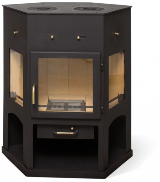 Большая плоская дверка по центру и два боковых стекла дают максимально возможный обзор горения в большой топке.